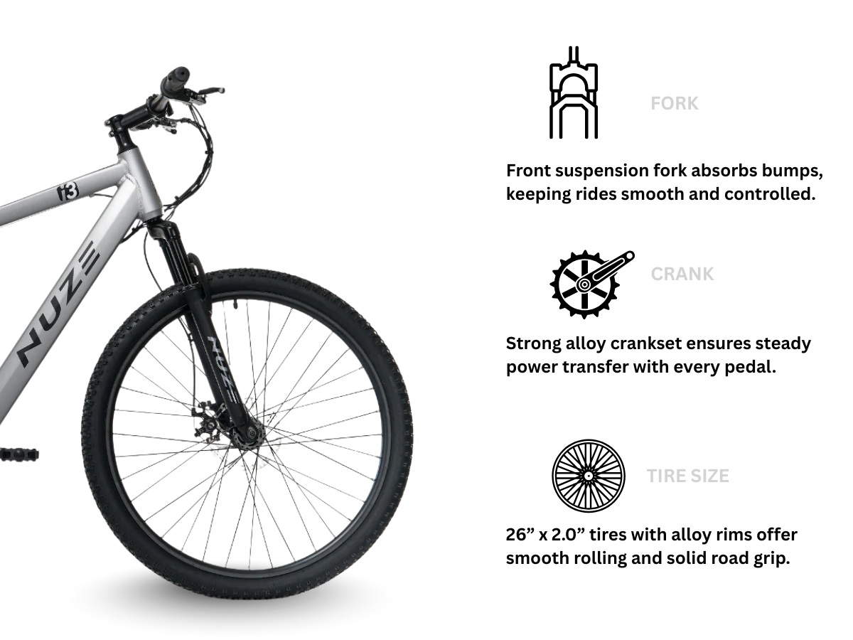The Nuze i3 electric bicycle comes with a Front Suspension Fork with a 50mm travel.