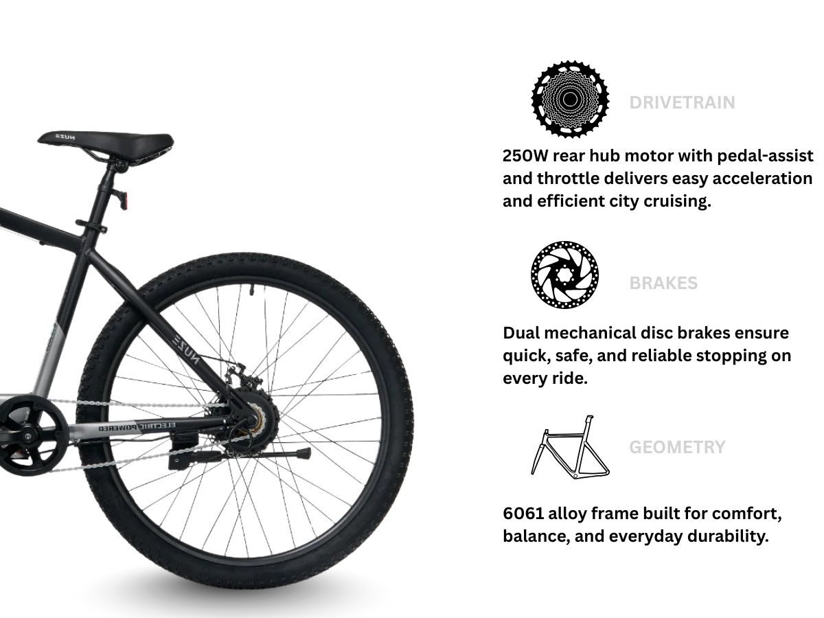 This electric bicycle from Nuze comes with Repute Mechanical Disc Brakes.